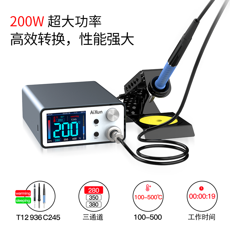 艾迅T3A是全球首款200w智能焊台。它兼容T12/T245手柄,可应用于各类焊接场景。采用智能温控系统,可在3秒内快速加热至380℃,温度精确度误差小于1%。24V电源输出,电压稳定无白噪声。超强防静电设计,满足工业ESD标准,安全又节能。最适合高端电子产品的手机维修和精密焊接。2.4英寸液晶彩色显示屛为您提供更好的视觉享受,有助于您提高工作效率。智能温度自记忆,实时休眠,有助于延长焊台和焊头的使用寿命。这是一款手机维修必备焊台。