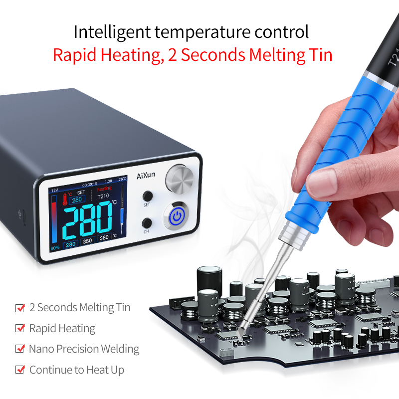 艾讯T3B 96W智能焊台支持T210和T115两款手柄,专为纳米和精密元件焊接而设计。它采用了最先进、最智能的温度控制系统,可在2秒内升温至380℃,温度精确度误差小于1%。全新软件补温功能,微电脑控制更精确,回温快,使用更顺心。金属制成的手柄座,散热更快速,可快速更换烙铁头。2.4英寸液晶彩色显示屏,轻松识别当前温度和工作状态。它的温度可在100-450℃之间调节,强大的抗静电设计符合工业ESD标准。远程无线升级是所有艾迅产品的优势和特点。这是一款适用于电子精密配件维修的焊台。